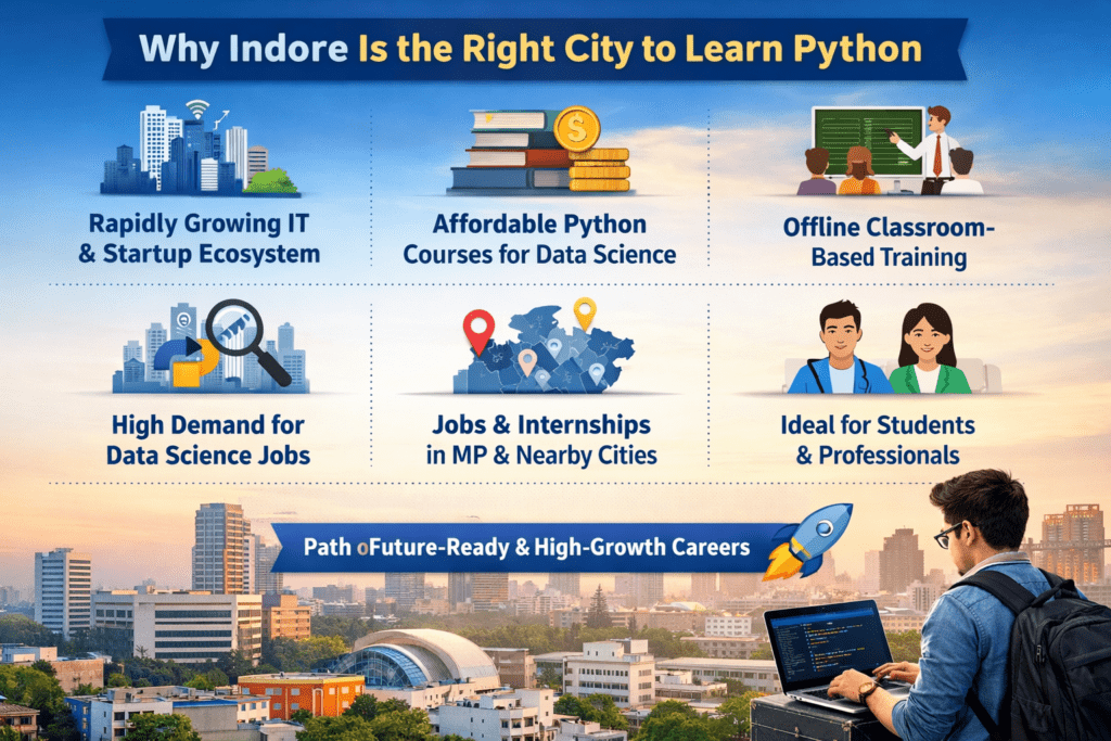 With Indore becoming a fast-growing education and IT hub, enrolling in a Python course in Indore for data science gives you access to practical training, affordable fees, and strong job opportunities. This blog explains how to learn Python step by step in Indore, especially for beginners, and how Python connects with the best data science and data analytics courses in Indore.